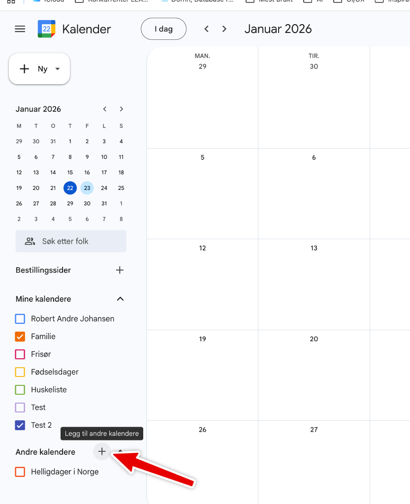 Nede til venstre på siden finner du Andre kalendere med et +-ikon. Klikk på dette og velg Opprett ny kalender. Gi kalenderen navnet på alternativet, for eksempel navnet på en snøscooter, et rom eller en ansatt.